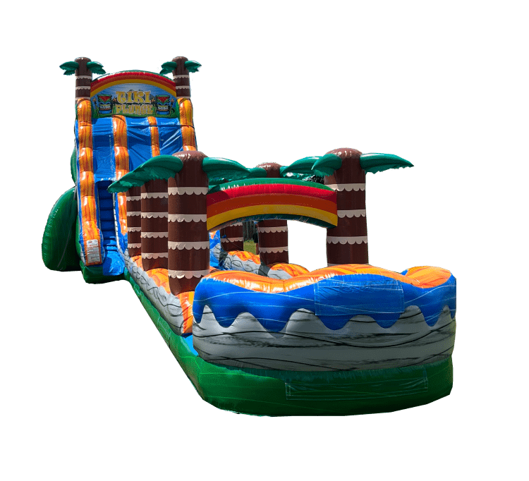 The 27 ft Tiki plunge is a heart-pounding inflatable slide that is an exhilarating experience as you slide down the steep drop, until you reach the splash pool at the end. As our 2nd biggest slide in our inventory, the Tiki Plunge will definitely be the talk of the party for years to come! This slide is a 3 day rental so you can keep the party going all weekend!!